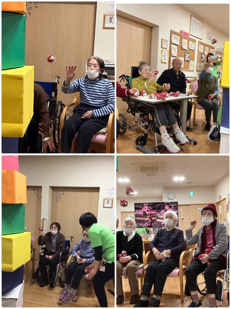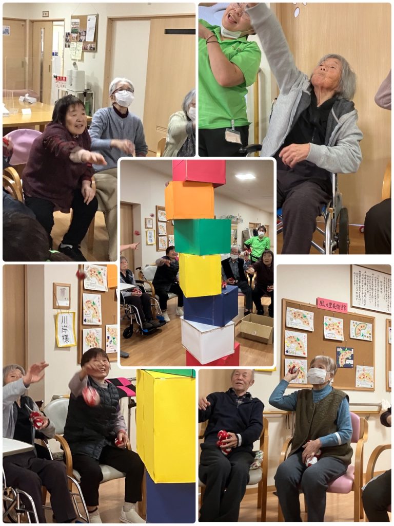 利用者の皆さん全員の力を合わせて玉を投げ当て、ダルマは見事に崩れてしまいました