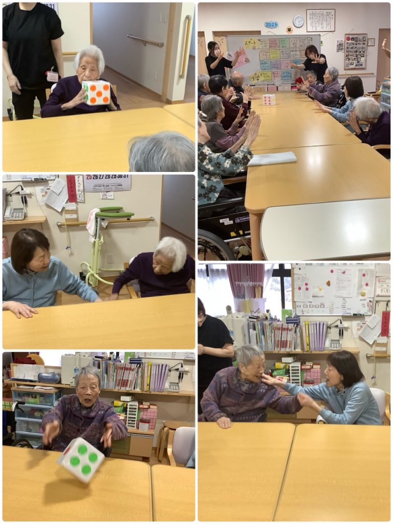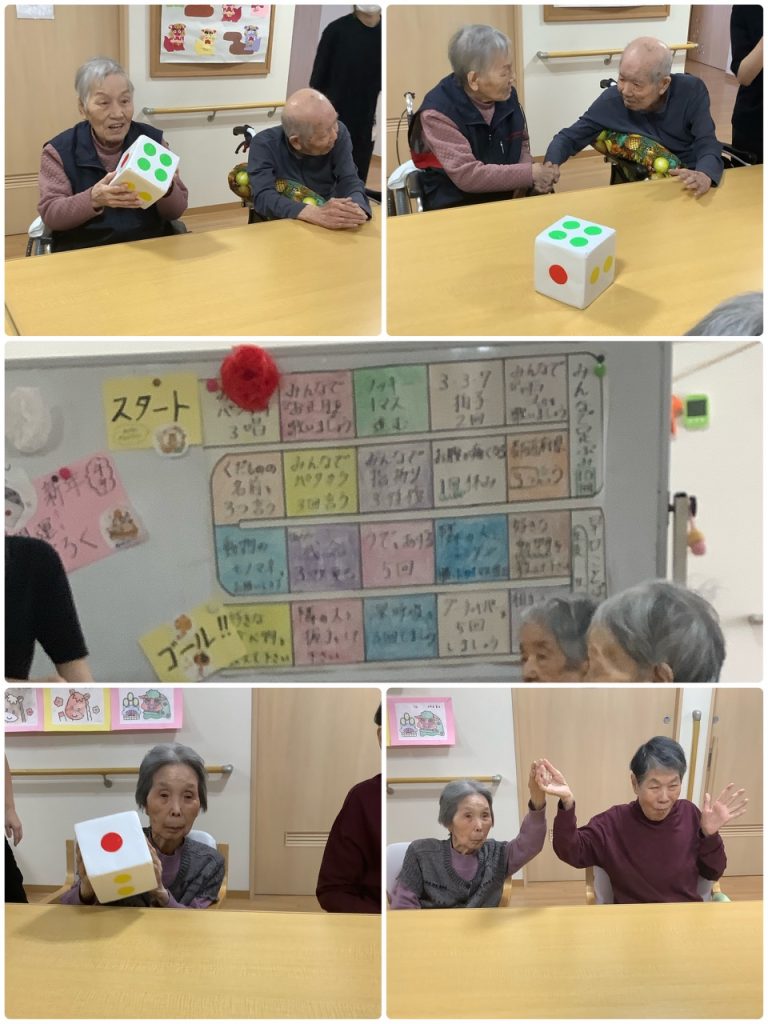 レクリエーションは、お正月にちなみ双六。チーム戦で行い転がした数だけ進み「隣の人と握手」に止まったら、