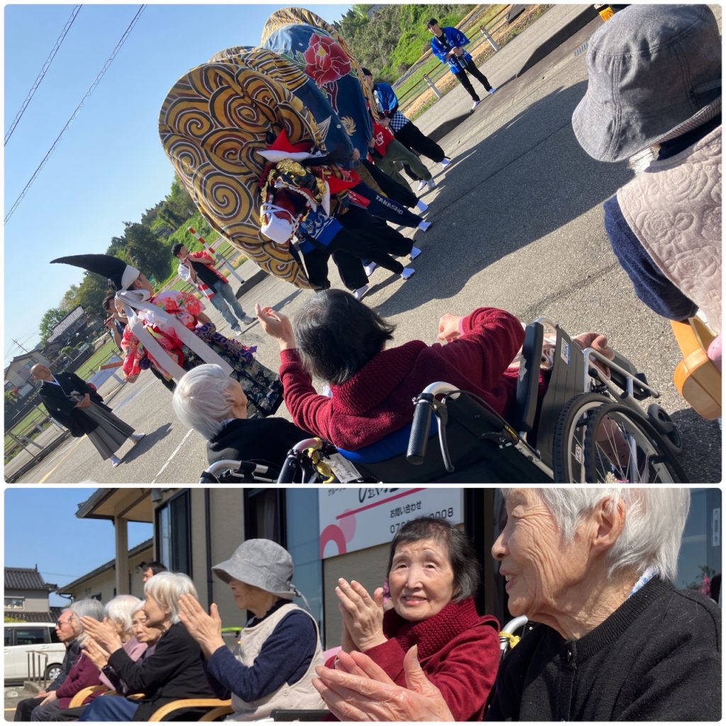 毎年恒例になった獅子舞、朝から外では太鼓や笛の音色が響いており賑やかな様子が聞こえ利用者の皆さんもワクワク☺️